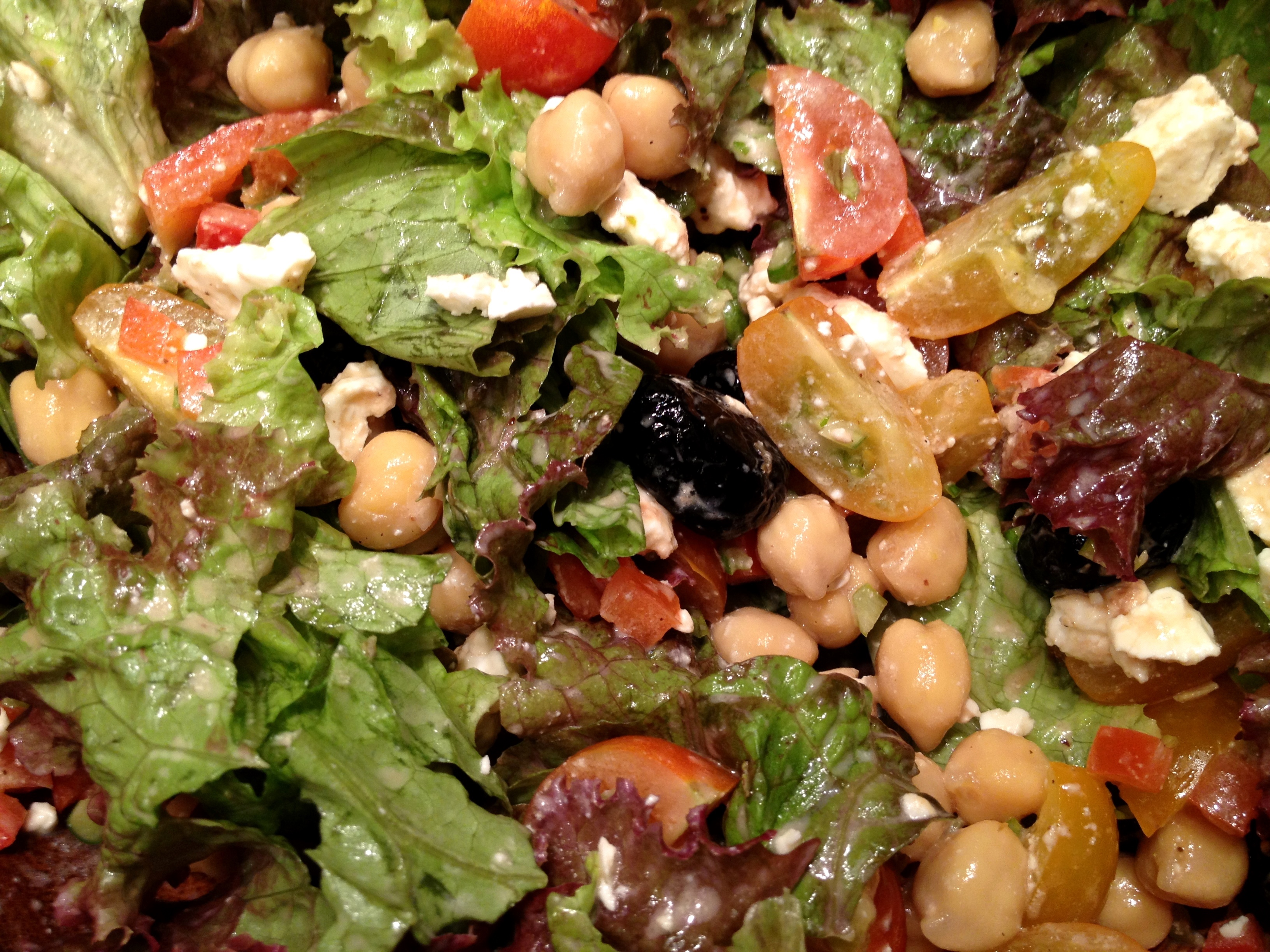 2. Now root around the fridge and pantry and see what you’ve got. I had some red leaf lettuce, baby heirloom tomatoes, feta and oil-cured olives. Hearts of palm or artichoke hearts would have been an excellent contribution from the pantry.