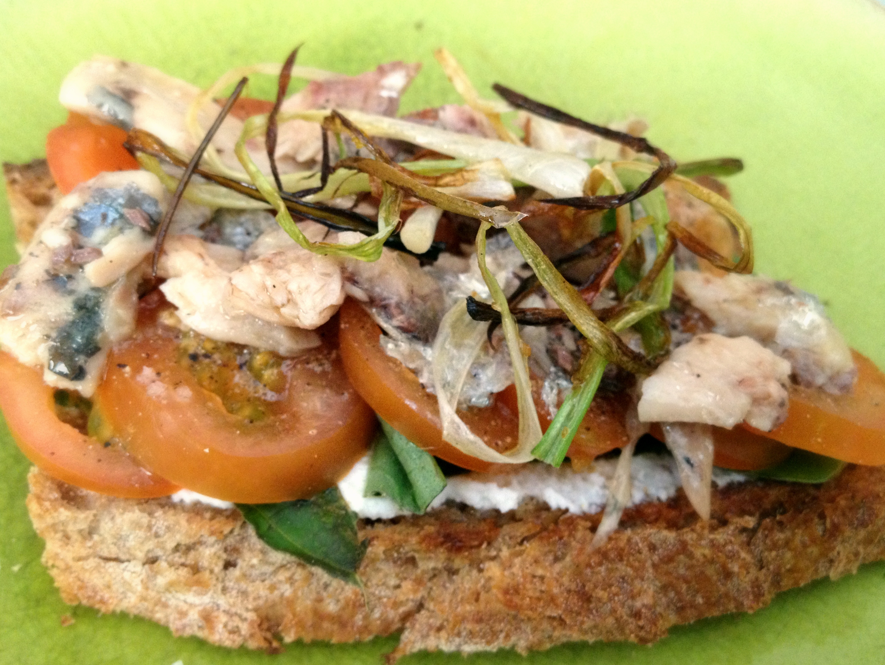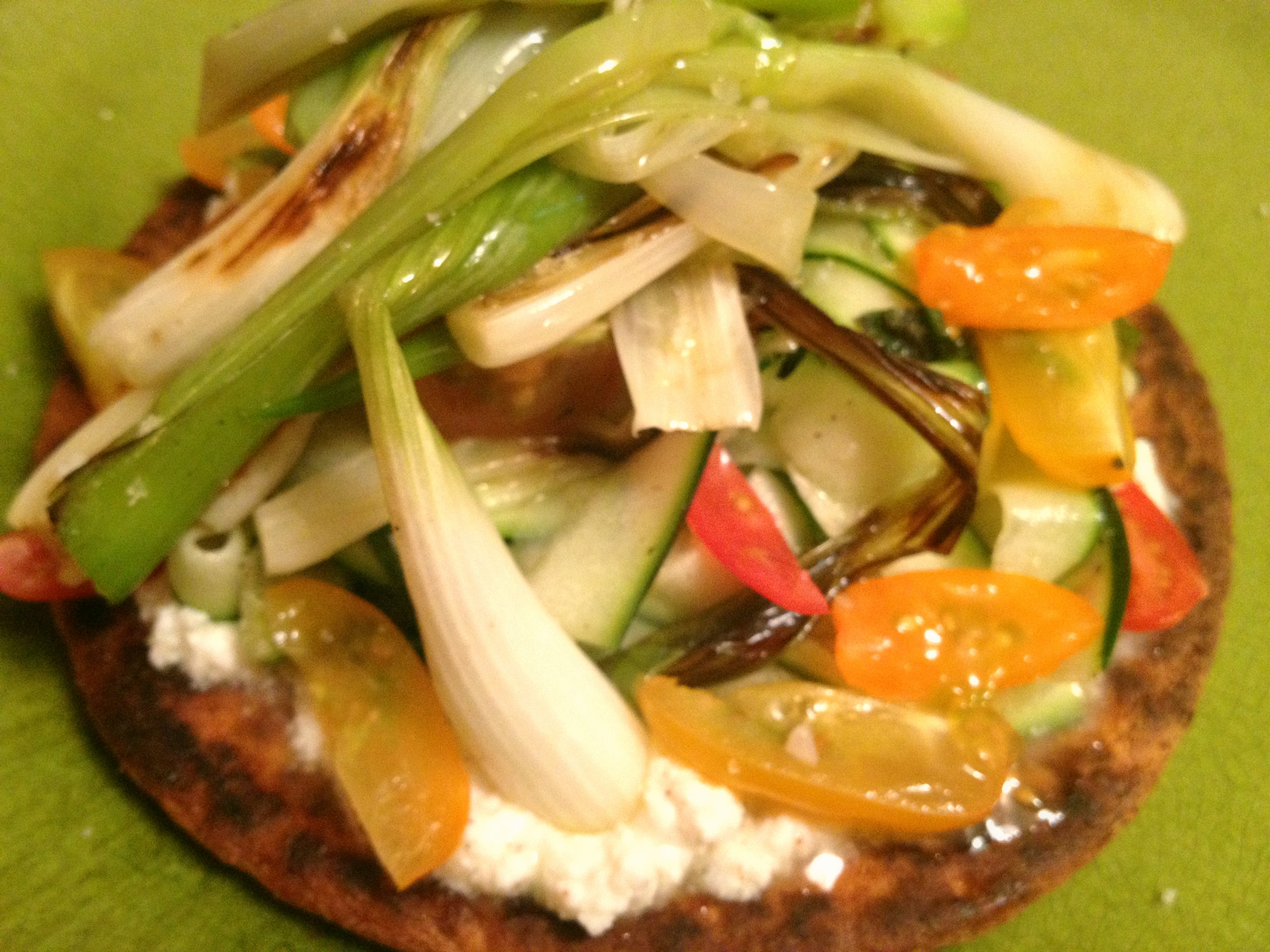 Tonight I seasoned the ricotta with nutmeg. I used a vegetable peeler to shave thin slices of zucchini and marinated them in lemon juice, fresh basil and a fruity olive oil. I topped it off with a few sliced cherry tomatoes and some scallions that I halved and grilled in the same cast iron pan that I used to toast the flatbread. When making something this simple, it’s important to season each element.  I added salt and pepper as I went and then sprinkled a little fleur de sel over the top.