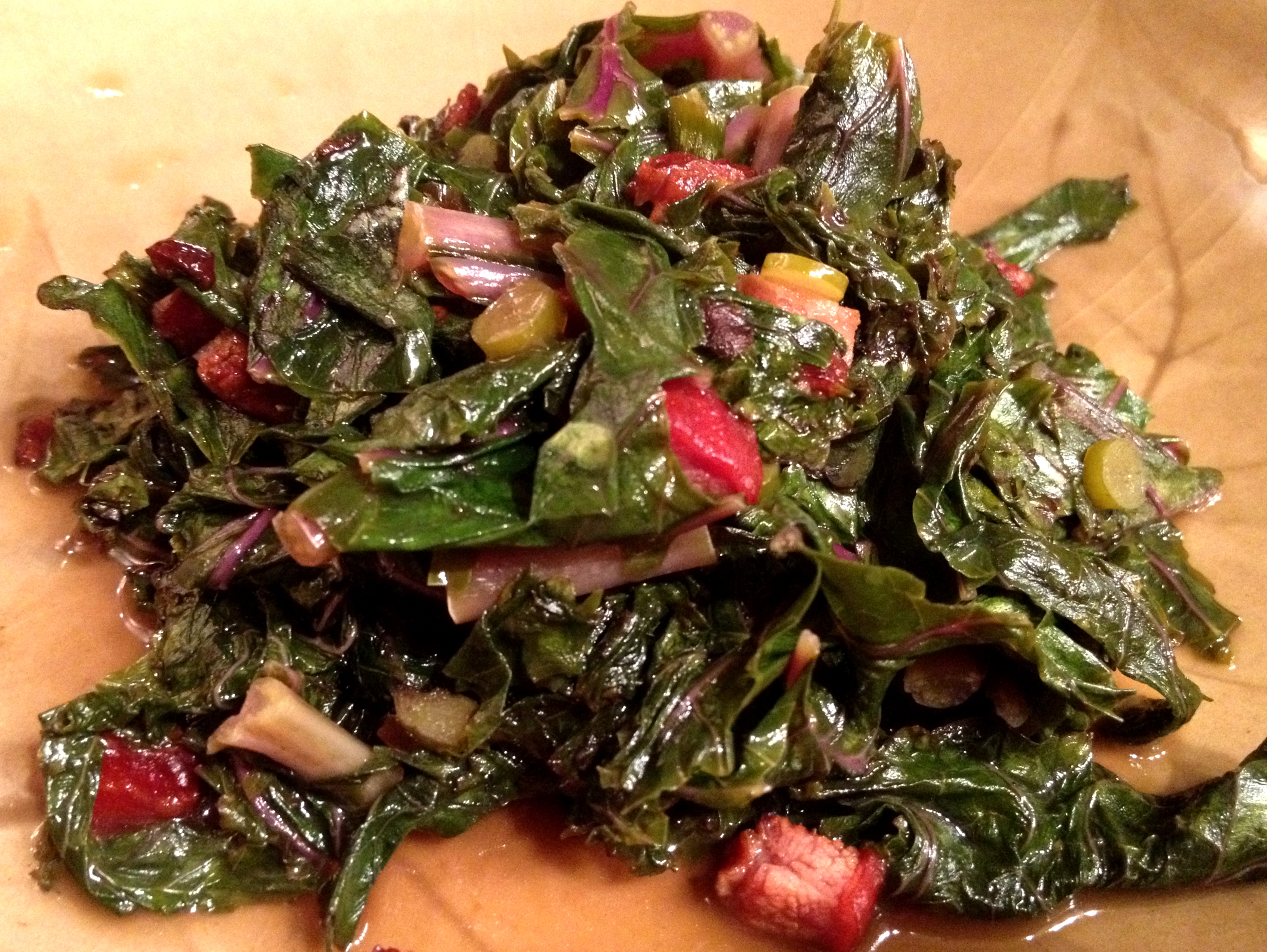 1. Heat some fat in a pan. You don’t need much–a tablespoon or so for a whole mess of greens. You can use olive oil, vegetable oil or something from the pork family, preferably smoked. For the greens picture above, I used an ounce of very lean slab bacon, which I rendered with a couple of teaspoons of olive oil.