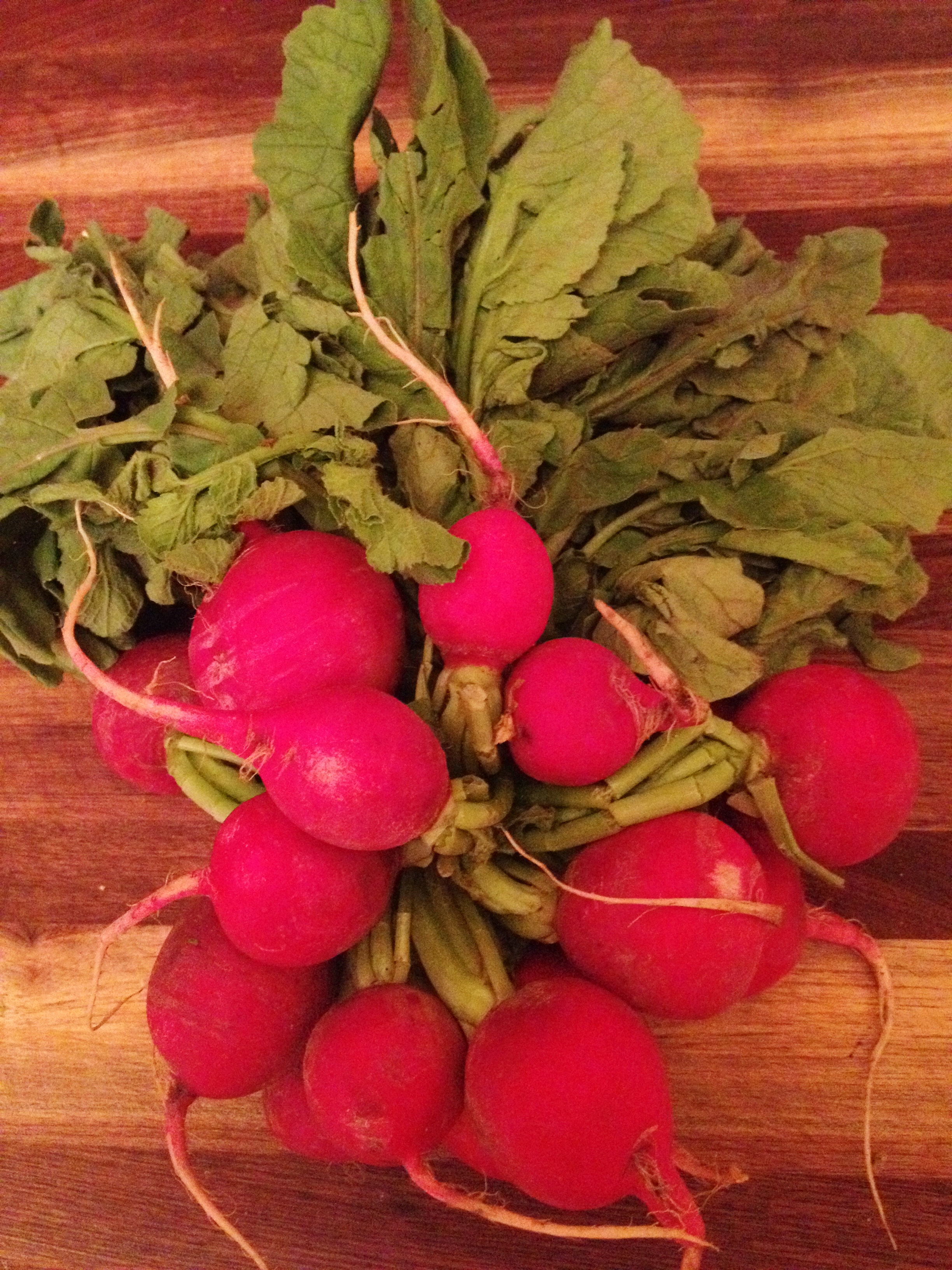 I opened the fridge to discover that the greens atop these radishes were beginning to wilt. If you haven’t caught on by now, I am a bit obsessed with dark leafy greens. Last summer, unable to bear the thought of throwing out such a bounty of greenery (and after having Googled to ensure that they were not poisonous), I decided to try eating the radish greens. They’ve got a slightly rough texture and a bitter, peppery flavor similar to the radish itself, but much more subtle. That is to say, they are delicious.
