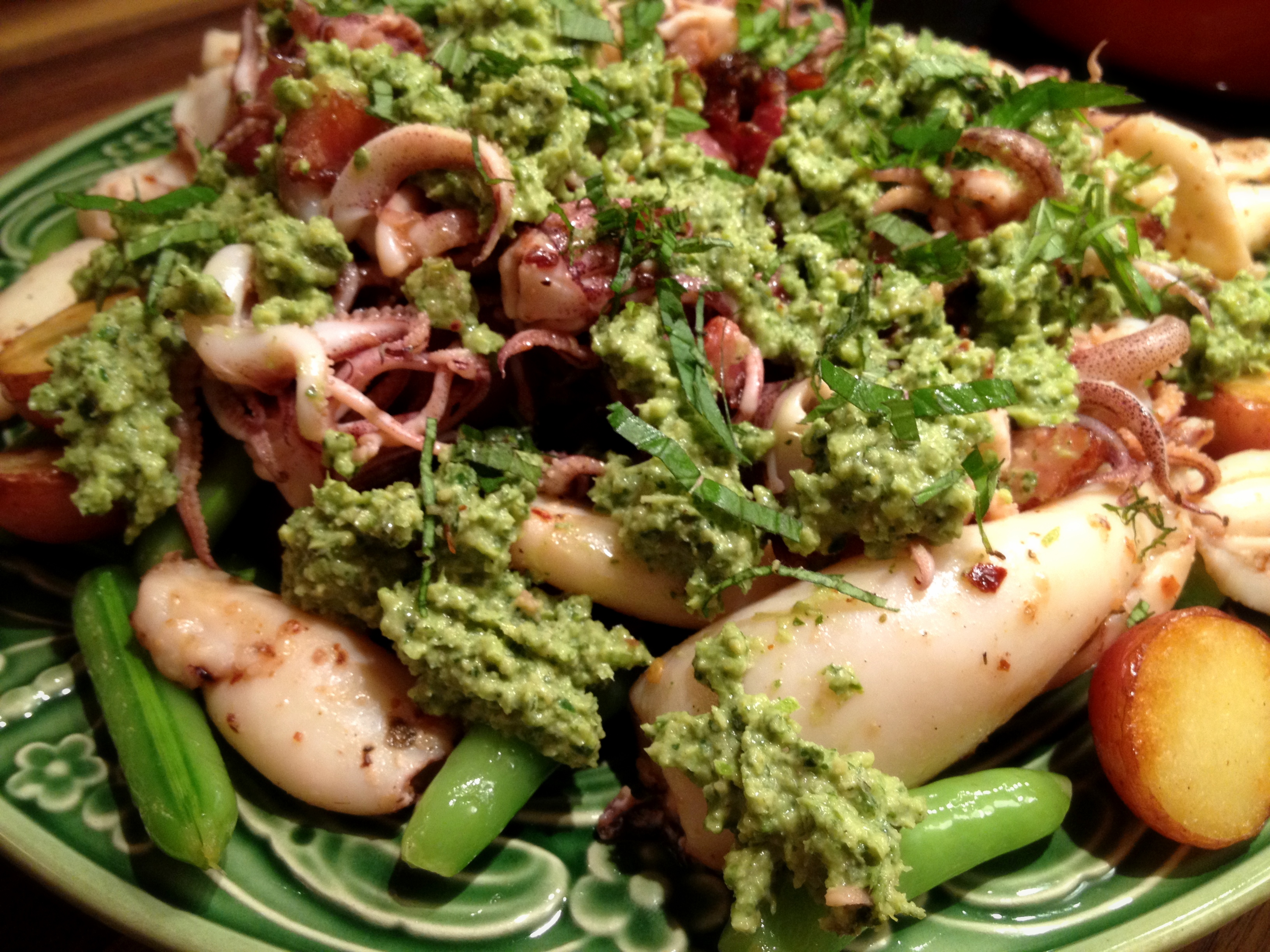 Spoon the potatoes and peas onto a platter and then add the bacon and squid as well as any juices left in the pan. Drizzle the whole thing with scape pesto and top with some thinly sliced mint leaves.