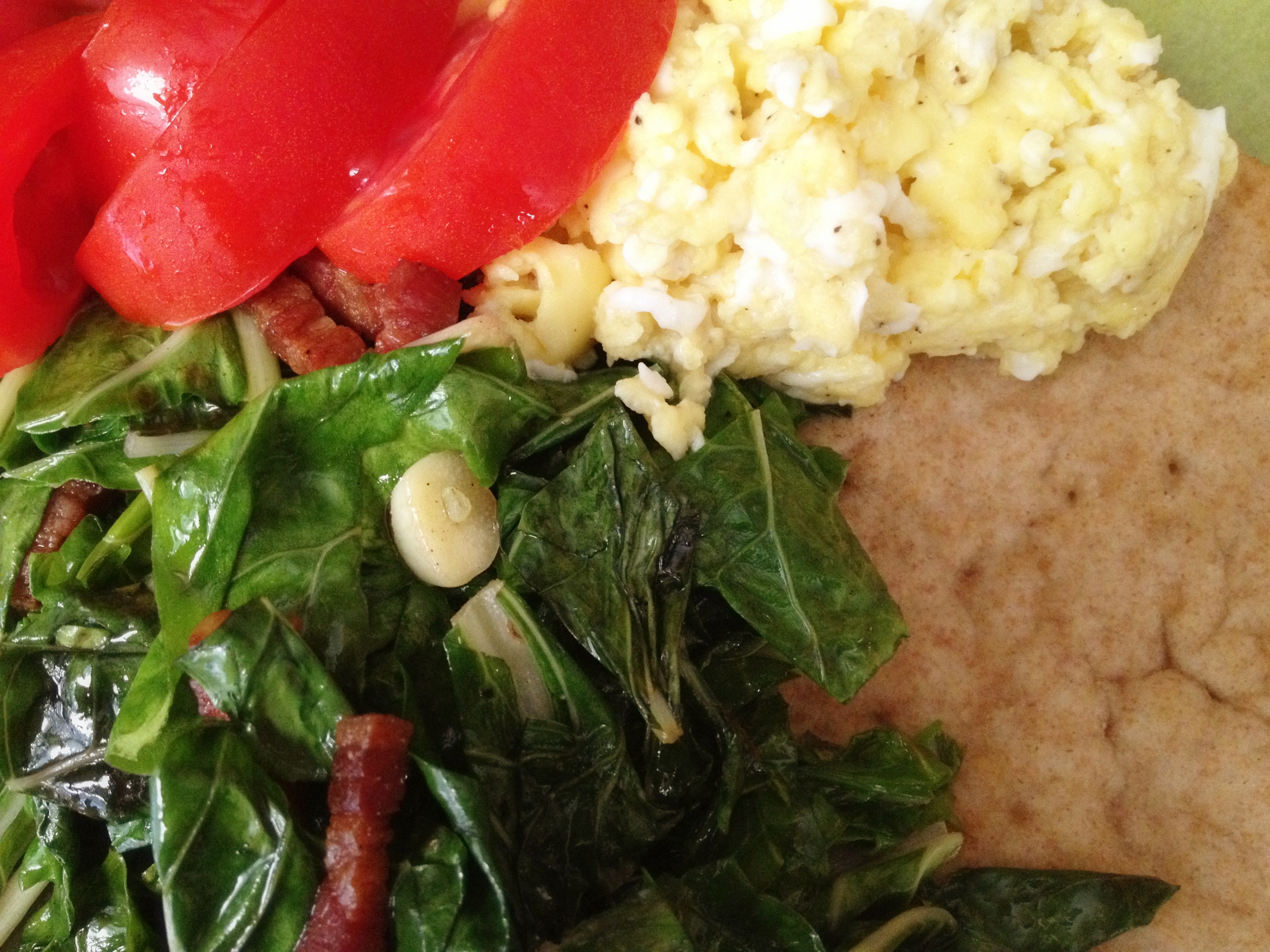 I knew I had some nice slab bacon and CSA veggies at home, so I swung by the grocery store for eggs. I sliced about half an ounce of bacon into lardon and rendered these in a cast iron skillet over medium heat. I added a few big chunks of garlic and toasted these in the bacon fat. I coarsely chopped a bunch of chard and sautéed it in the pan before adding salt and pepper. I slid the wilted greens to the side and toasted half of a whole wheat flatbread right in the skillet. I made some scrambled eggs in another pot and threw it all together, adding half of a very ripe tomato.