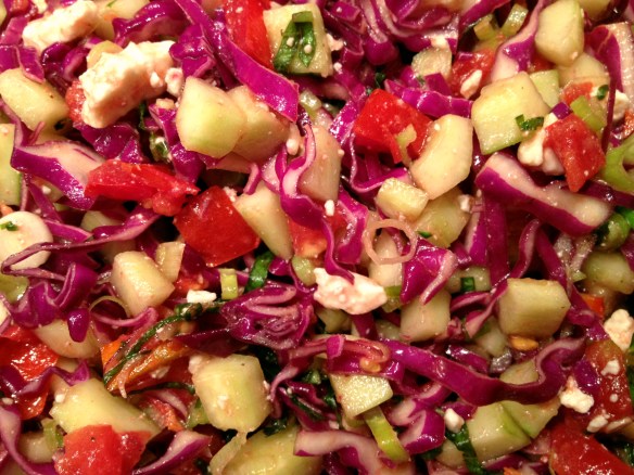 The tomatoes are here! Tonight’s CSA share included basil, cucumbers, scallions and some truly glorious tomatoes. I had a wedge of red cabbage left over from the five-spice kale and cabbage slaw I made for a Fourth of July Party. And I has some feta–yet another great emergency protein source.