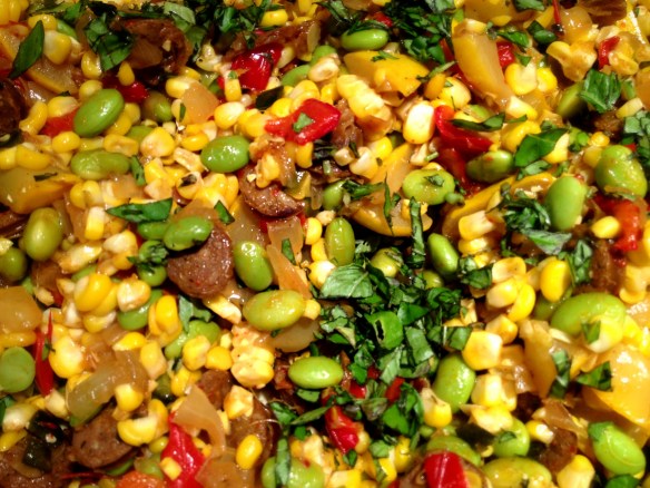 For the succotash, I browned some kosher Andouille sausage (yes, that exists—and it’s surprisingly good) in a little olive oil in cast iron skillet. I added onions, poblano pepper and red bell pepper. In time, I added the pattypan squash, some shelled edamame and fresh corn cut from the cob. Salt, pepper and basil went in just before serving.
