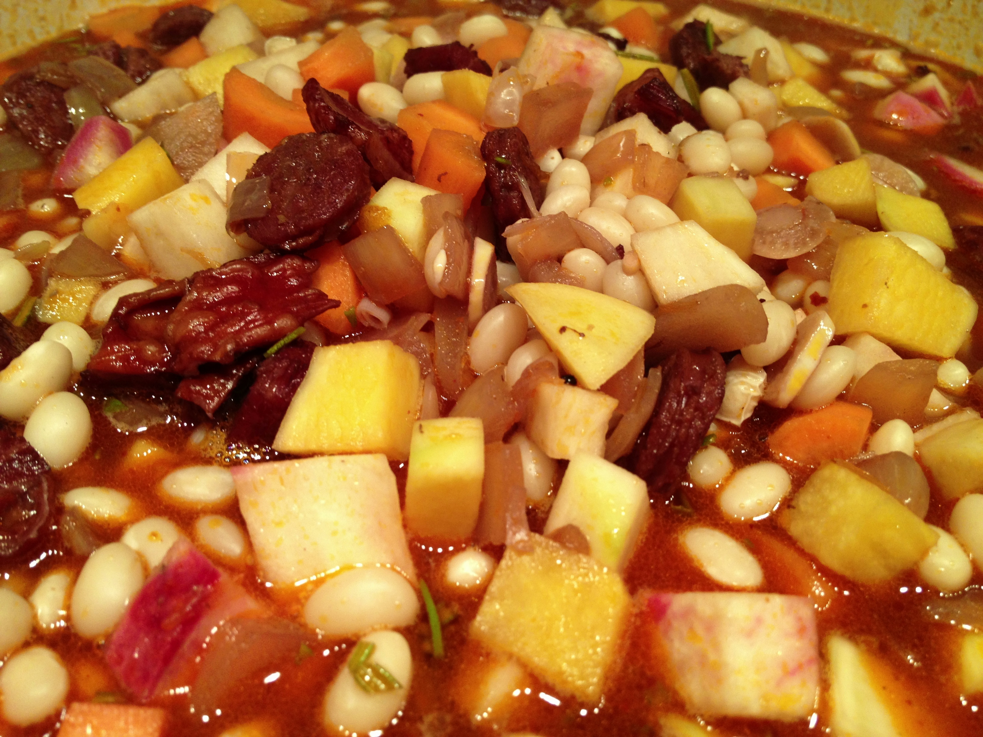 - Add a bunch of diced root vegetables. I used six carrots, four rutabagas, and one freakishly large radish. Top this off with enough water that the beans are just submerged and pop it in the oven with a lid. This is what it will look like, more or less.