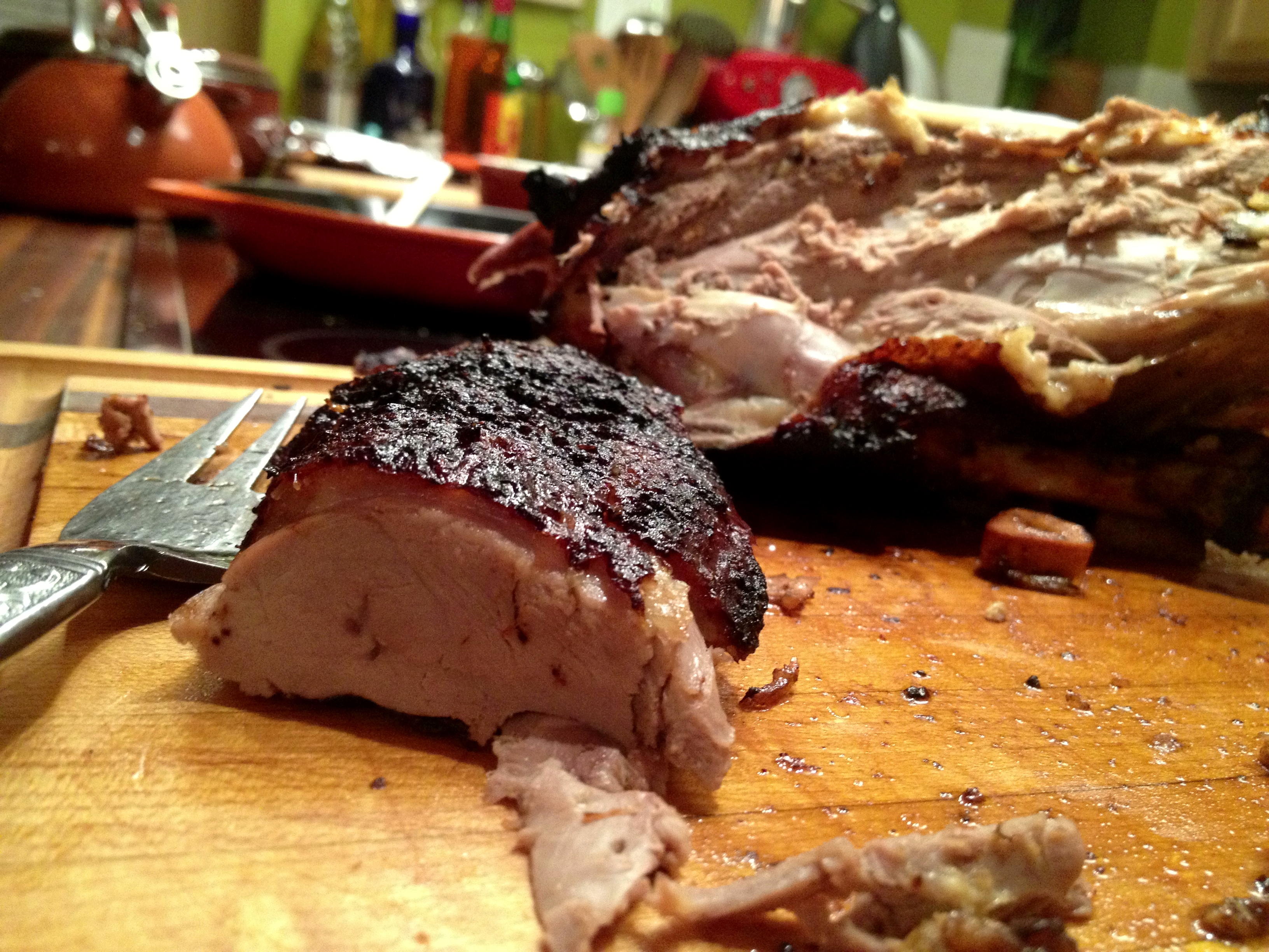 Saturday, sometime after 10:00pm – I am not sure what I did while the chicken roasted (save for ponder whether my oven temperature was accurate), but at some point the bird was finally, mercifully done. Even better, my makeshift roasting rack had proven a success. I hacked off a leg, scooped out some stuffing, and went to town.