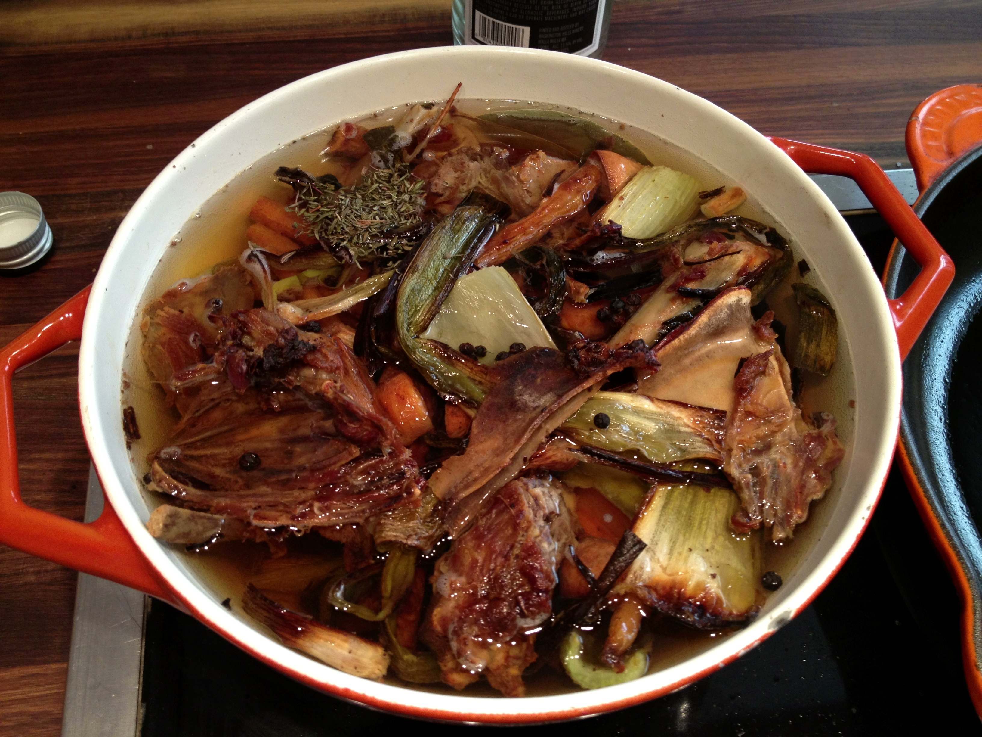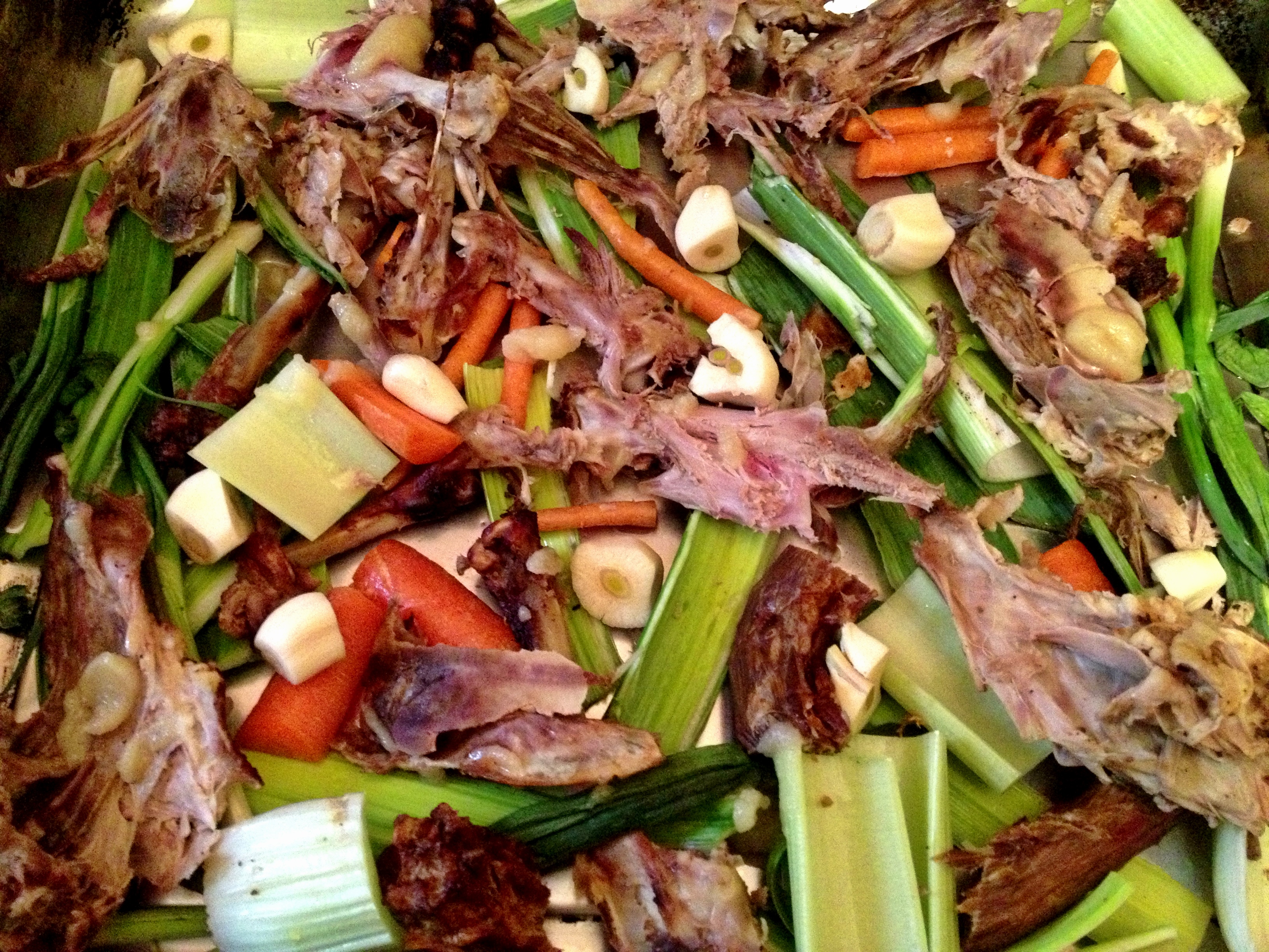 Sunday, 12:00pm – Having put in a couple of solid hours researching mentions of New Orleans and the Bywater in The New York Times, my vegetable stock had achieved a rich caramel hue. I strained it into a bowl, pressing on the solids to squeeze out any additional broth. I was about to discard the dregs when I remembered the chicken carcass I had drunkenly picked before bed. The bones and the leftover vegetables went back into the pot with whatever was left in the fridge – another onion, some garlic, and a bit more celery. This all simmered for a couple of hours before being strained and placed in the fridge.
