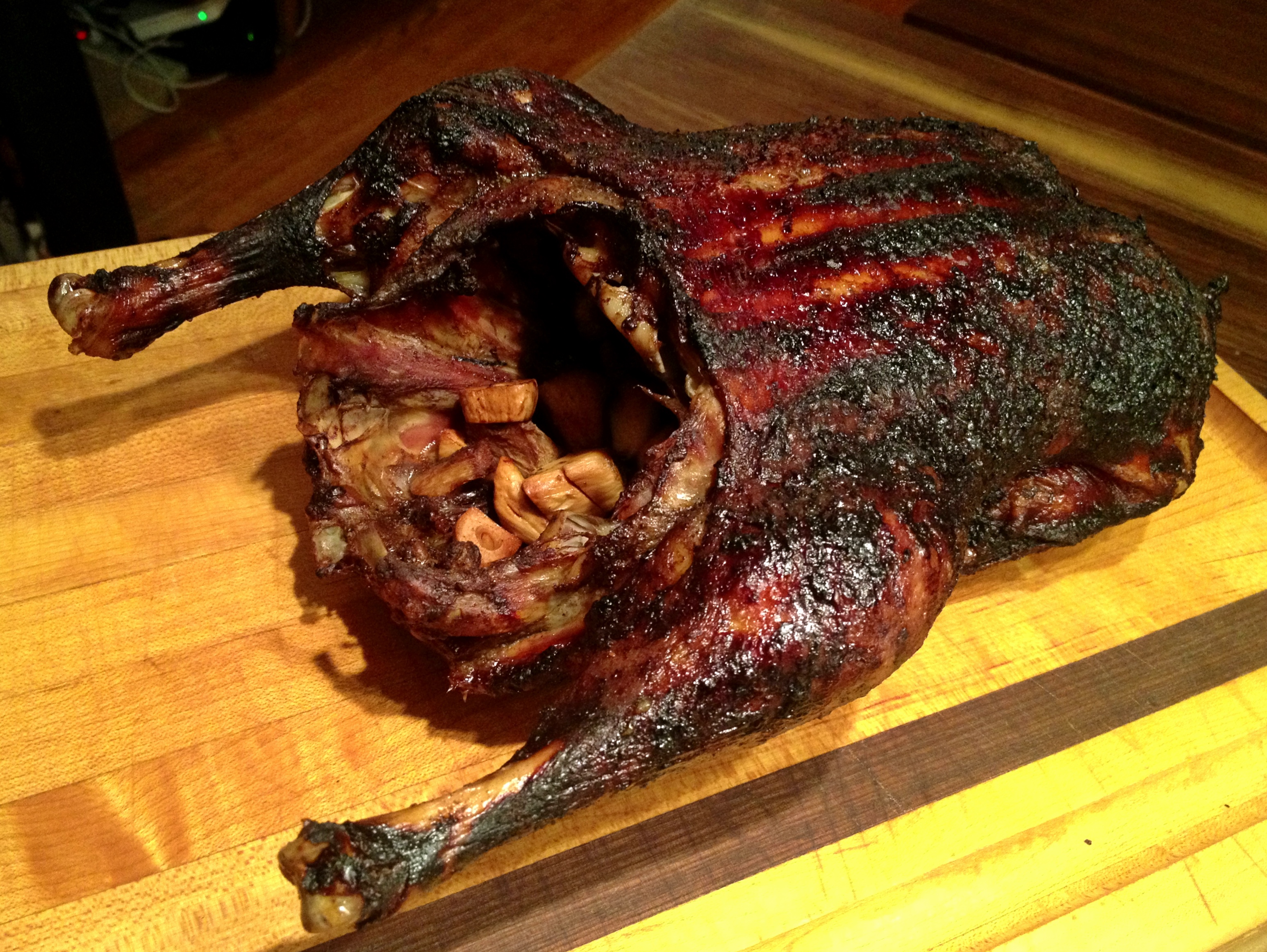 Saturday, 8:30pm – It had been several hours since my lunchtime salad and the beer had gone straight to my head. There was a light rapping at my door. A neighbor who had spent the day on a silent meditation hike and knew that I was grounded for the weekend wordlessly handed me a very full glass of red wine. That is the only excuse I can come up with for this compromising photo of my beautiful stuffed heritage chicken.