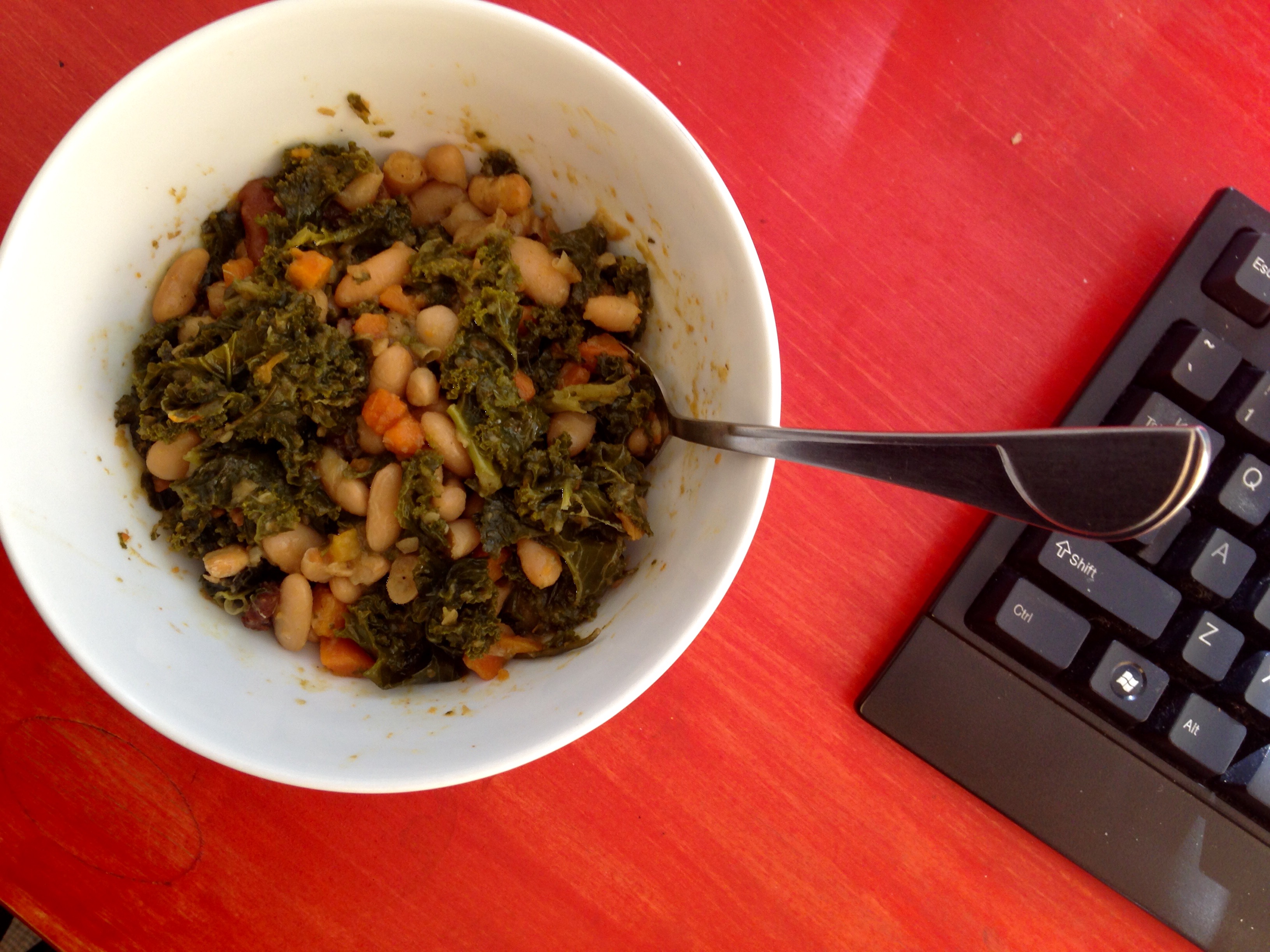 I logged eleven hours at the office today. This included the first of two days of all-staff training, which was a great experience, but also exhausting–so much so that I boarded the wrong train home, overshooting my destination by 45 or so blocks. Mercifully, I had some curried pumpkin, tofu and kale left from Sunday night’s dinner. I consumed this cold and straight out of the container, standing at the kitchen counter.
