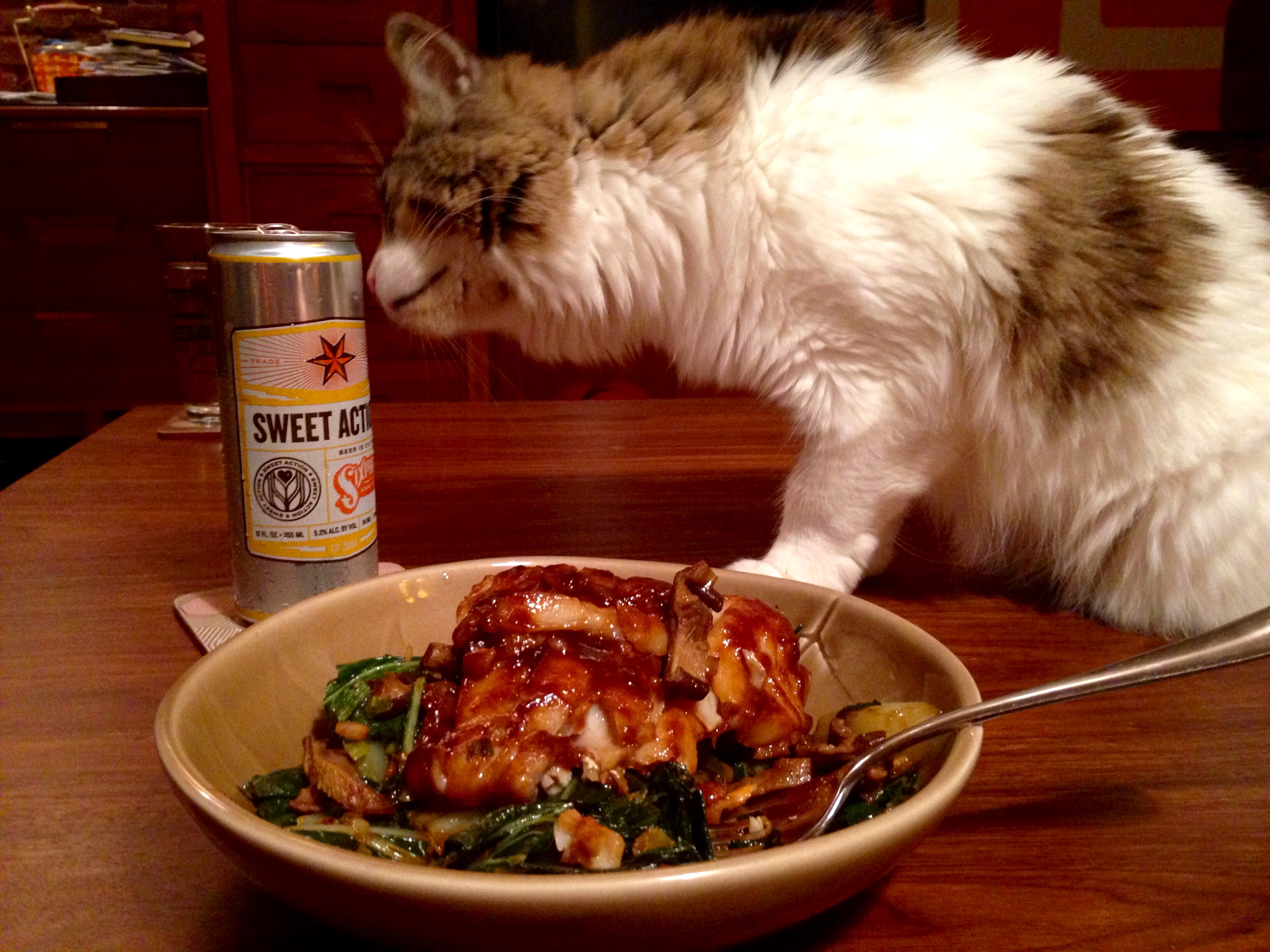 You could serve this over a pile of steamed rice. I opted to take my carbs in the form of a Sixpoint Sweet Action, which is pretty much my all-time favorite beer. Oona digs it too.