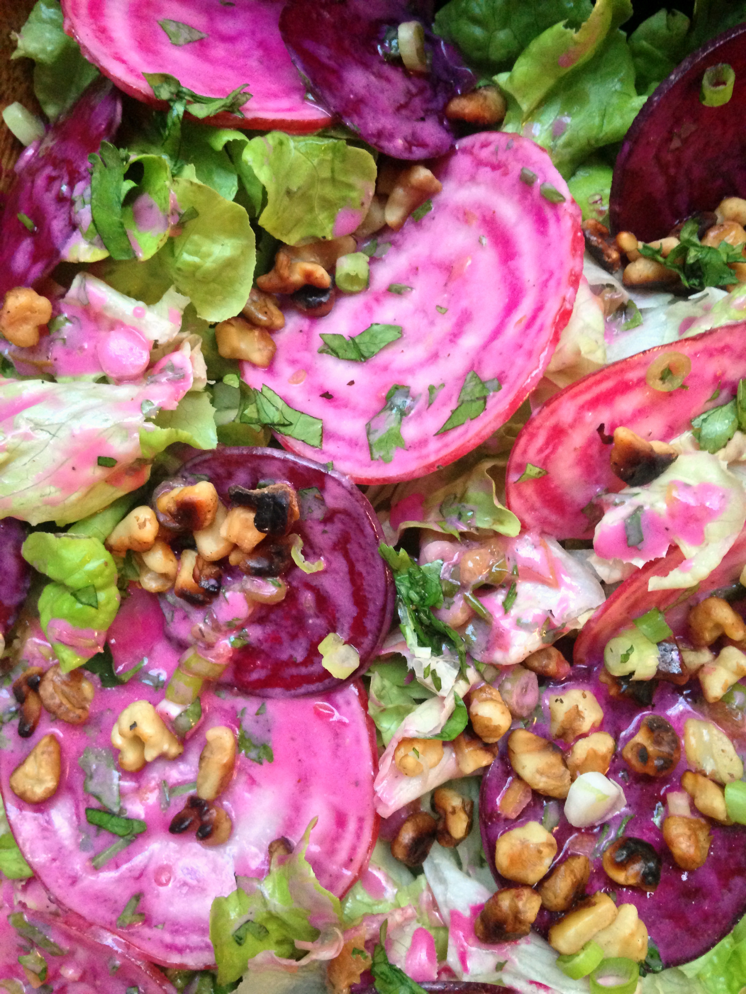 The temperature dropped a bit today, but my body has yet to catch up. What is ordinarily a 10-minute walk to pick up my CSA share took me nearly double. By the time I got home, bags laden with green vegetables, I had lost all ambition to cook. Luckily, Farmer Fred excels when it comes to lettuce and I still had the beets from last week’s share. The salad below came together in less time that it took to eat it.
