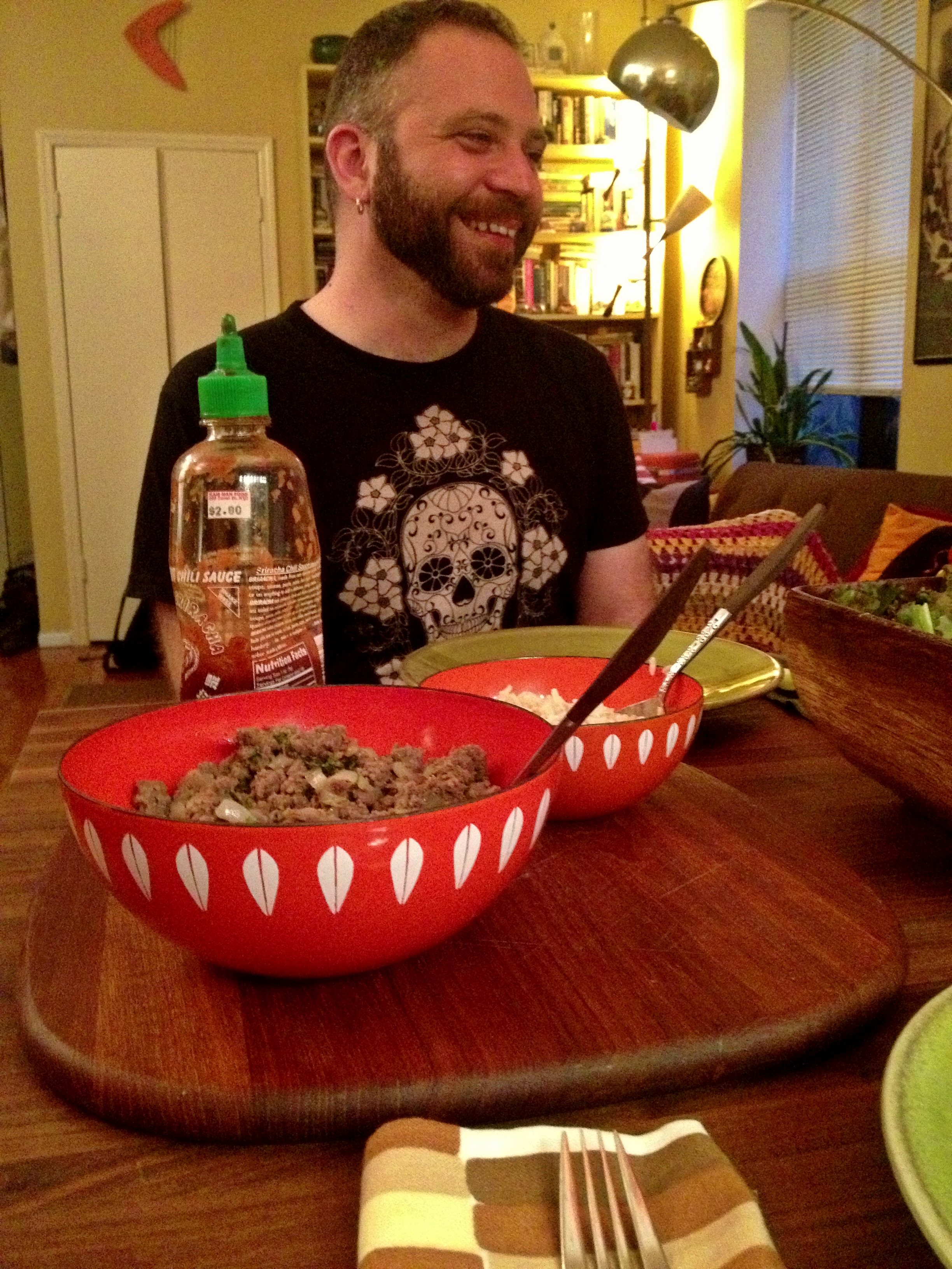 Justin arrived a little after 7:00, by which time I had polished off the wine. Justin busied himself making a batch of gin cocktails with sweet vermouth and the poaching liquid from my foray into homemade maraschino cherries. I got to work on my best approximation of Larb, a dish that I associate with Thai food, although the internet tells me that it is actually Laotian.