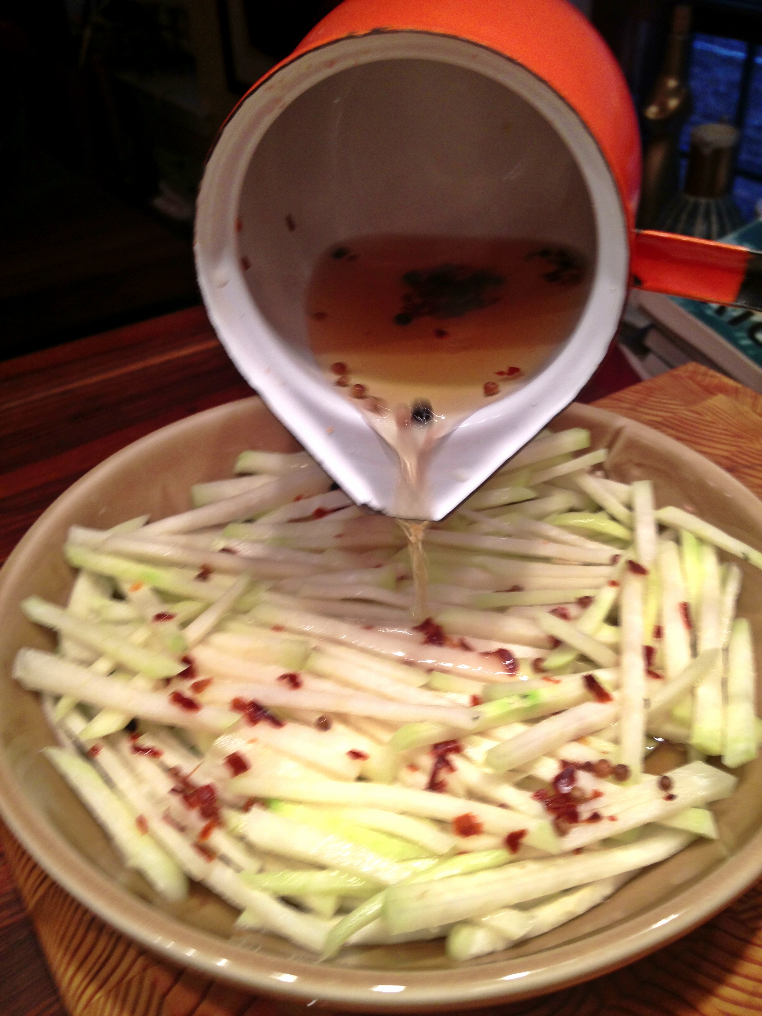 Combine all but the kohlrabi in a very small saucepan and bring to a simmer over medium heat. While you’re waiting, peel the kohlrabi and cut into matchsticks. Pour the hot brine over the kohlrabi and let stand for an hour or so, stirring occasionally. If you have the time, toss it in the fridge to chill.