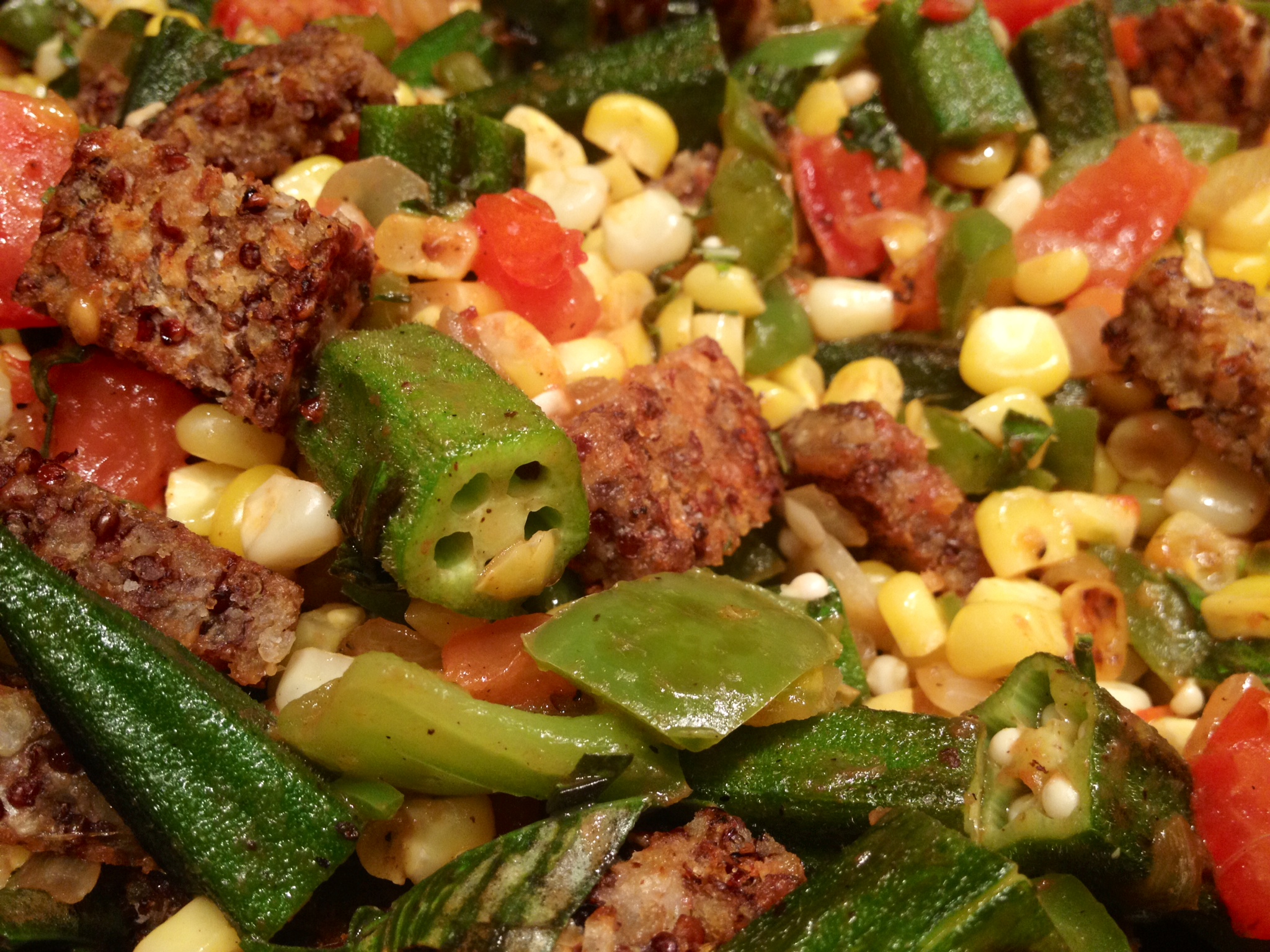 Luckily, I had some Flying Pigs Farm Canadian bacon in the freezer to complement Farmer Ted‘s peak summer vegetables. By the time I had stashed the last of the onions and washed and dried the gorgeous purple lettuce, I’d hatched a plan. This is a meal that comes together fast, so you’ll want to have everything prepped and ready to go before you start sautéing.