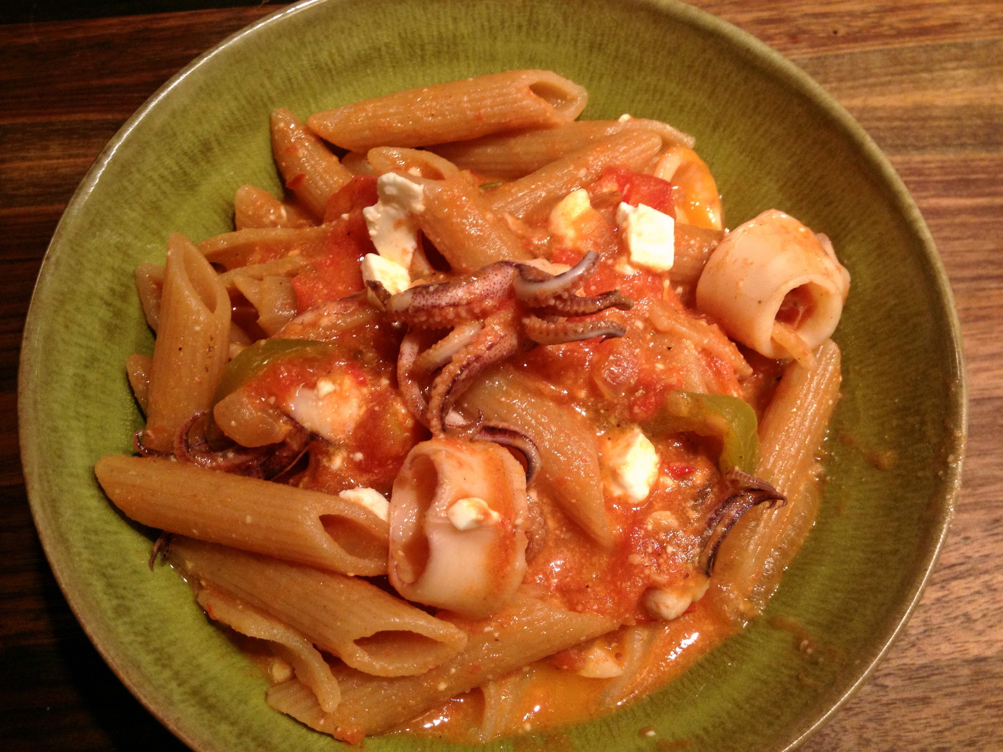 I failed to get a shot of last night’s meal, which included a salad with the aforementioned purple lettuce, yellow tomatoes and crumbled ricotta salata in a classic red wine vinaigrette plus hunks of crusty baguette. But I just polished off this bowl of leftover pasta for lunch and am surprised to report that it was even tastier served cold the next day. (I suspect this has to do with the pig fat having some time to permeate the pasta.)